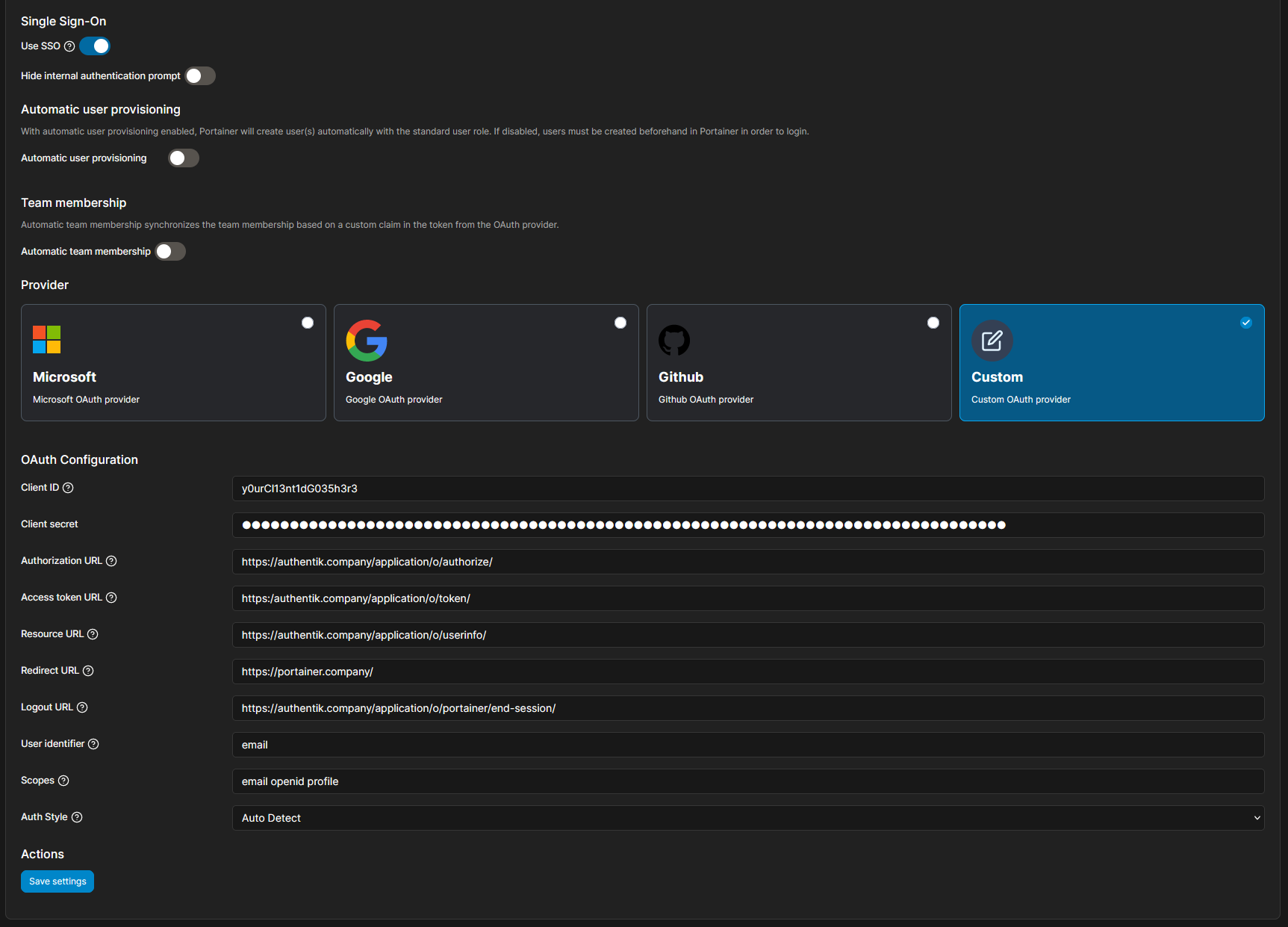 In Portainer, under Settings, Authentication, Select OAuth and Custom