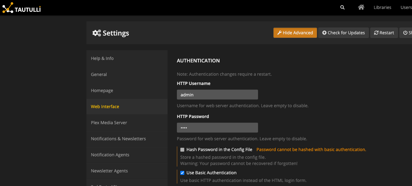 In Tautulli, navigate to Settings and enable the "Show Advanced" option. Navigate to "Web Interface" on the sidebar, and ensure the Option Use Basic Authentication is checked.